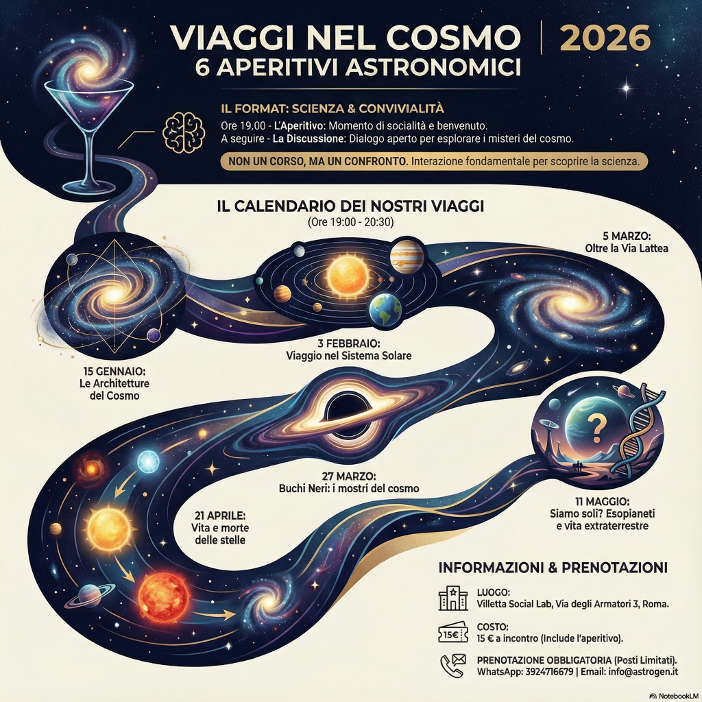 L’Associazione AstroGen APS inaugura il 2026 con un nuovo ciclo di sei incontri intitolato “Viaggi nel Cosmo”, ospitato presso la Villetta Social Lab. Questi appuntamenti non sono semplici corsi di astronomia, ma sono stati pensati come una discussione aperta tra amici, dove l’interazione e il confronto sono fondamentali per esplorare insieme i misteri dell’universo.